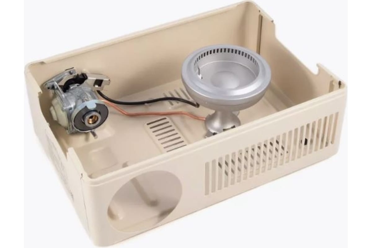 Плита оборудована одной горелкой с кольцевым образованием пламени, имеет пьезоэлектрический розжиг и блок управления подачи газа. Оборудованная магнитным клапаном(редуктором), в качестве топлива используются газовые смеси в баллонах с нажимным клапаном и цанговым захватом.