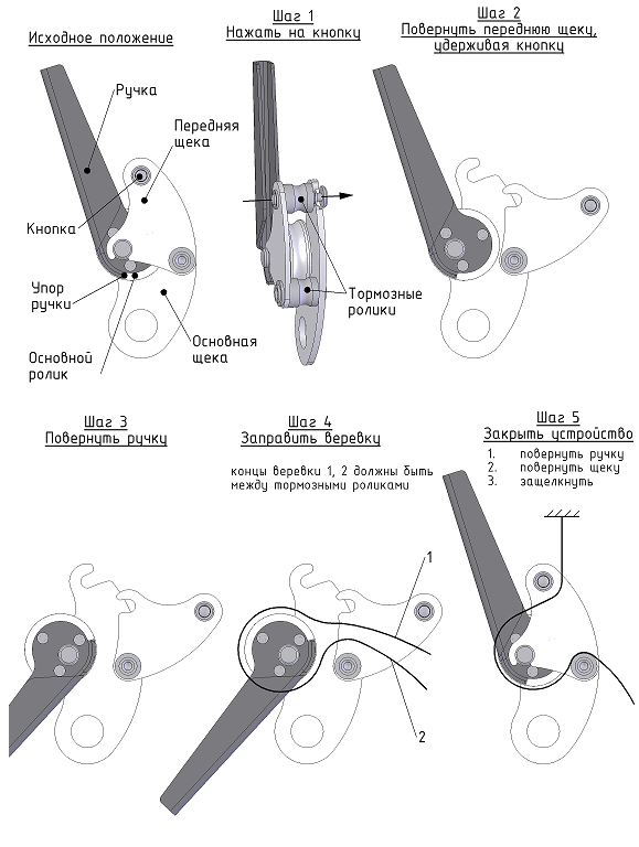 устройство не требует отсоединения от карабина для заправки верёвки;