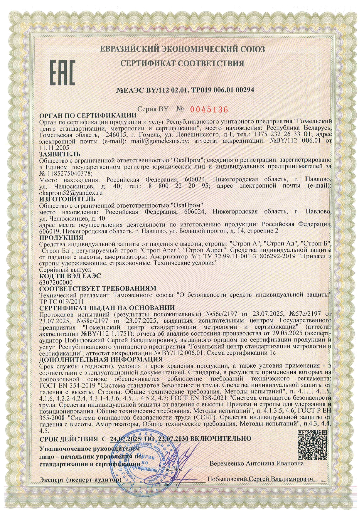 Соответствие ГОСТ Р ЕН 358-2008, ГОСТ Р ЕН 354-2010, ГОСТ Р ЕН 355-2008, ТР ТС 019/2011